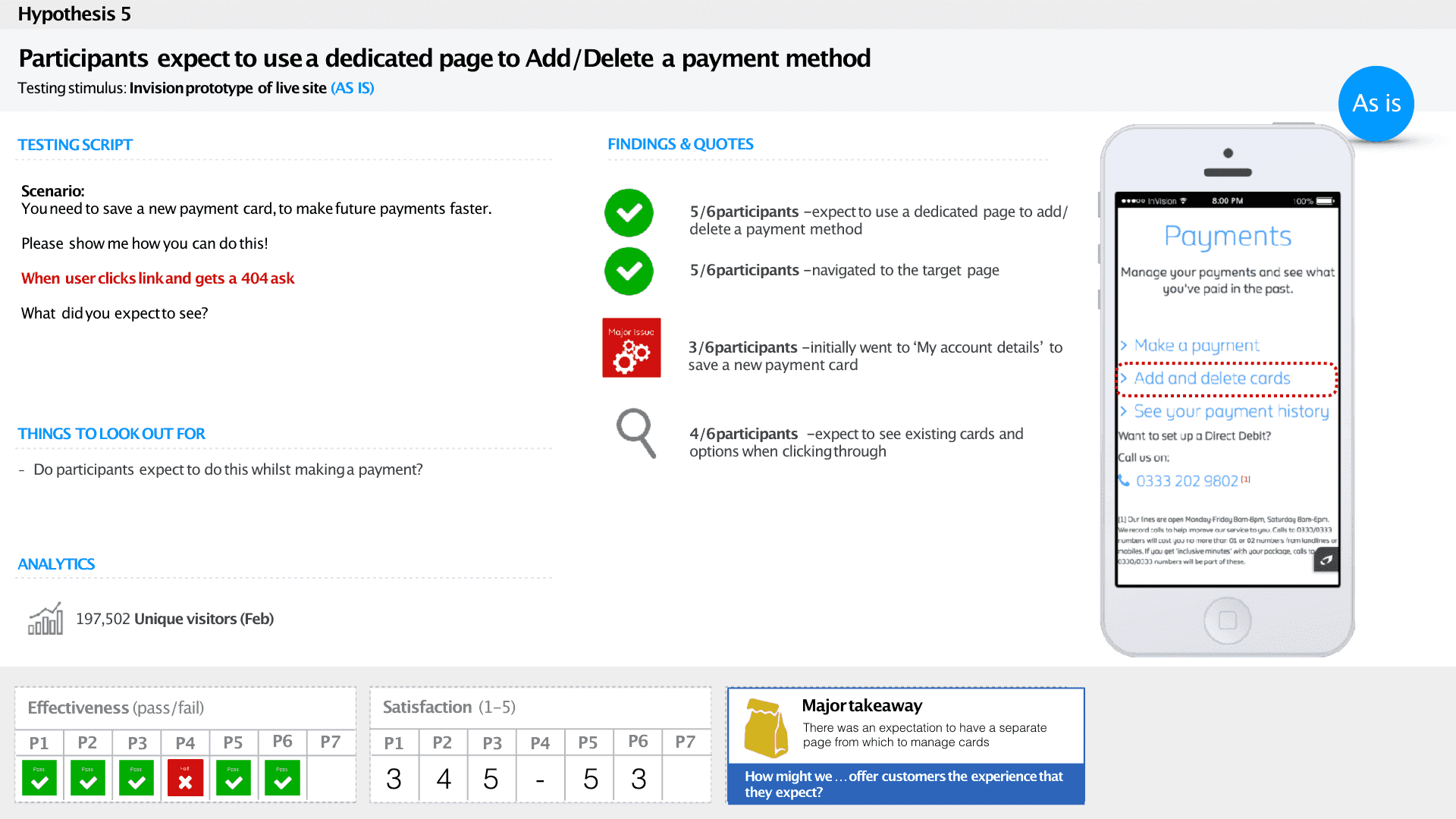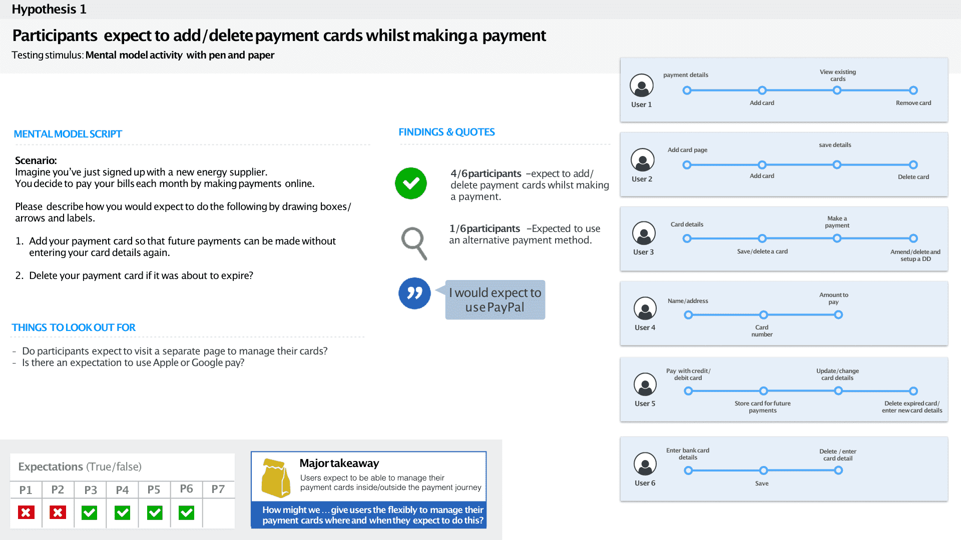 This research method was used during a usability test, to understand if users expected to add or delete a payment card whilst in the payment journey. 4/6 participants did expect to do this whilst in the journey.