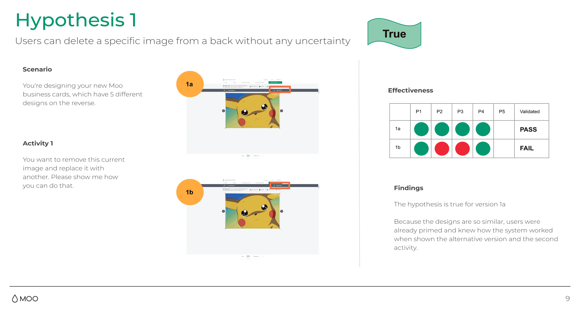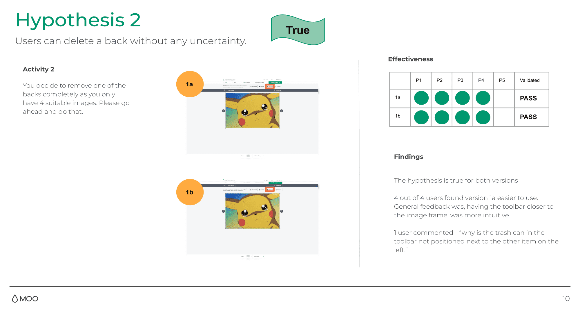 Four people in the office were shown a screen-grab from the staged environment. They were asked to complete 2 activities for each variant. This would allow us to determine if it was clear how to delete an image and a unique back.