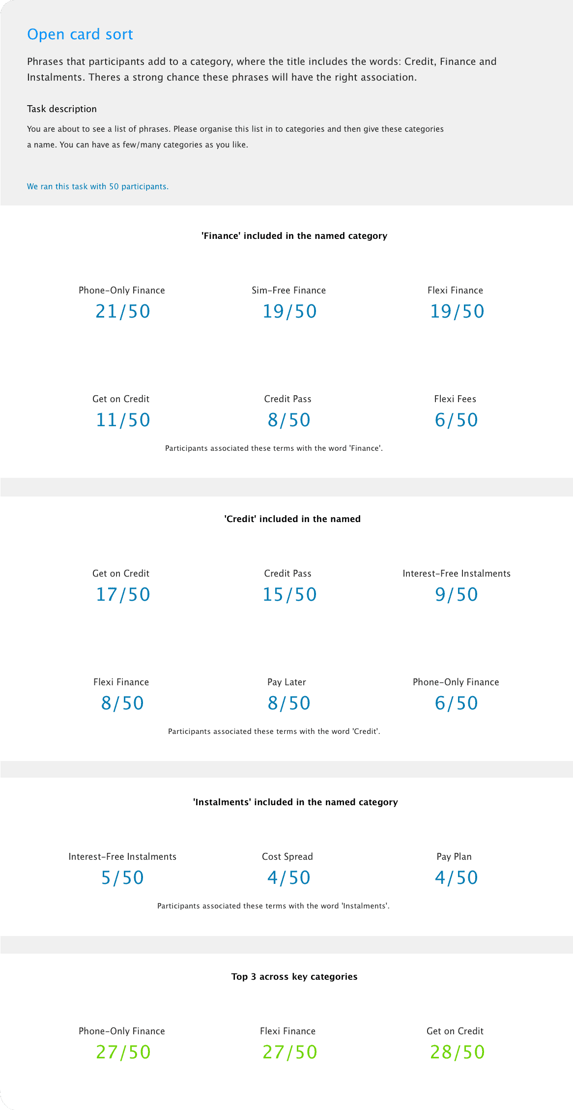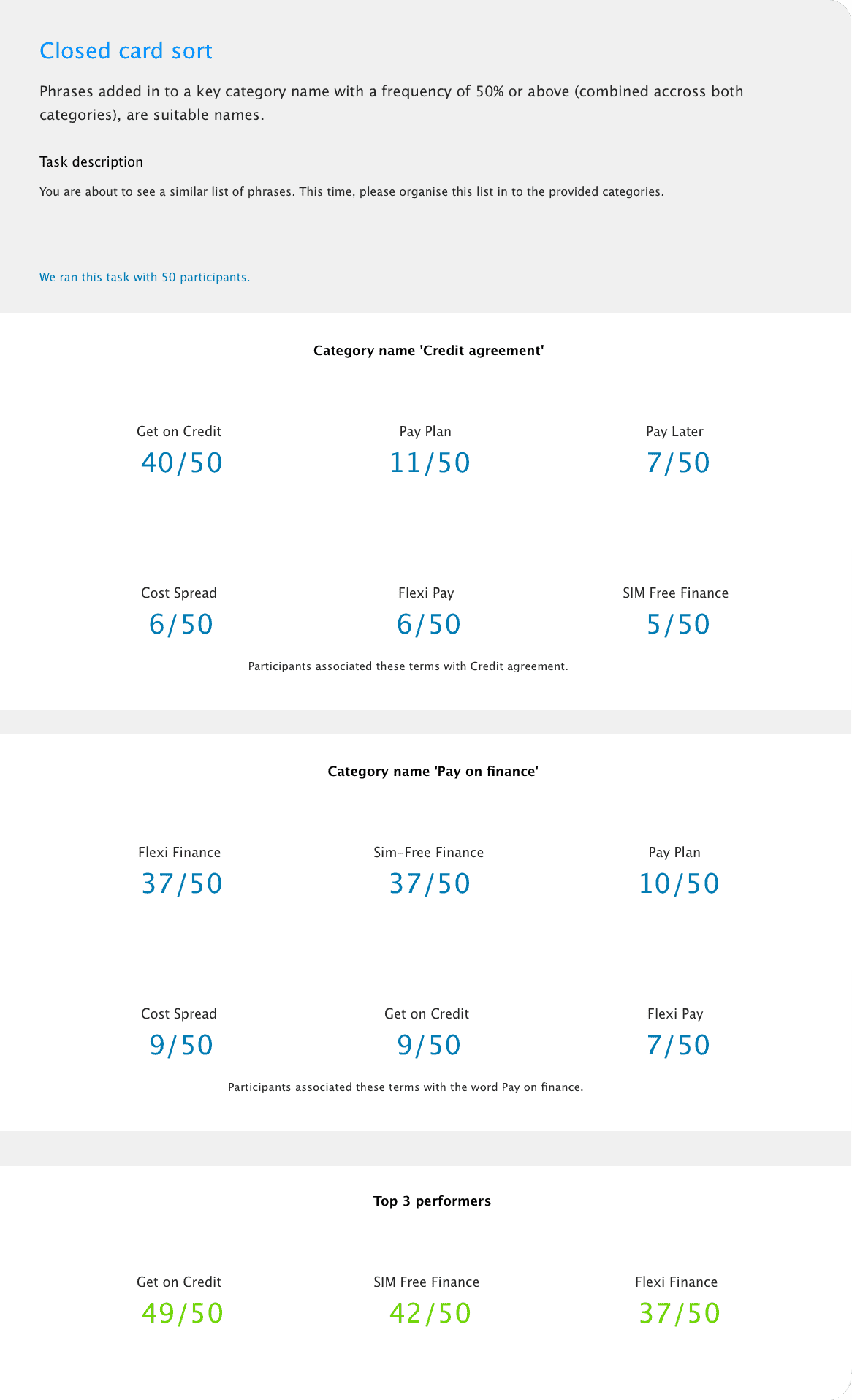 Our copywriter crafted a bunch of potential names for the proposition. Open and closed card sorting research was used to find phrases with the closest association to purchasing on credit.