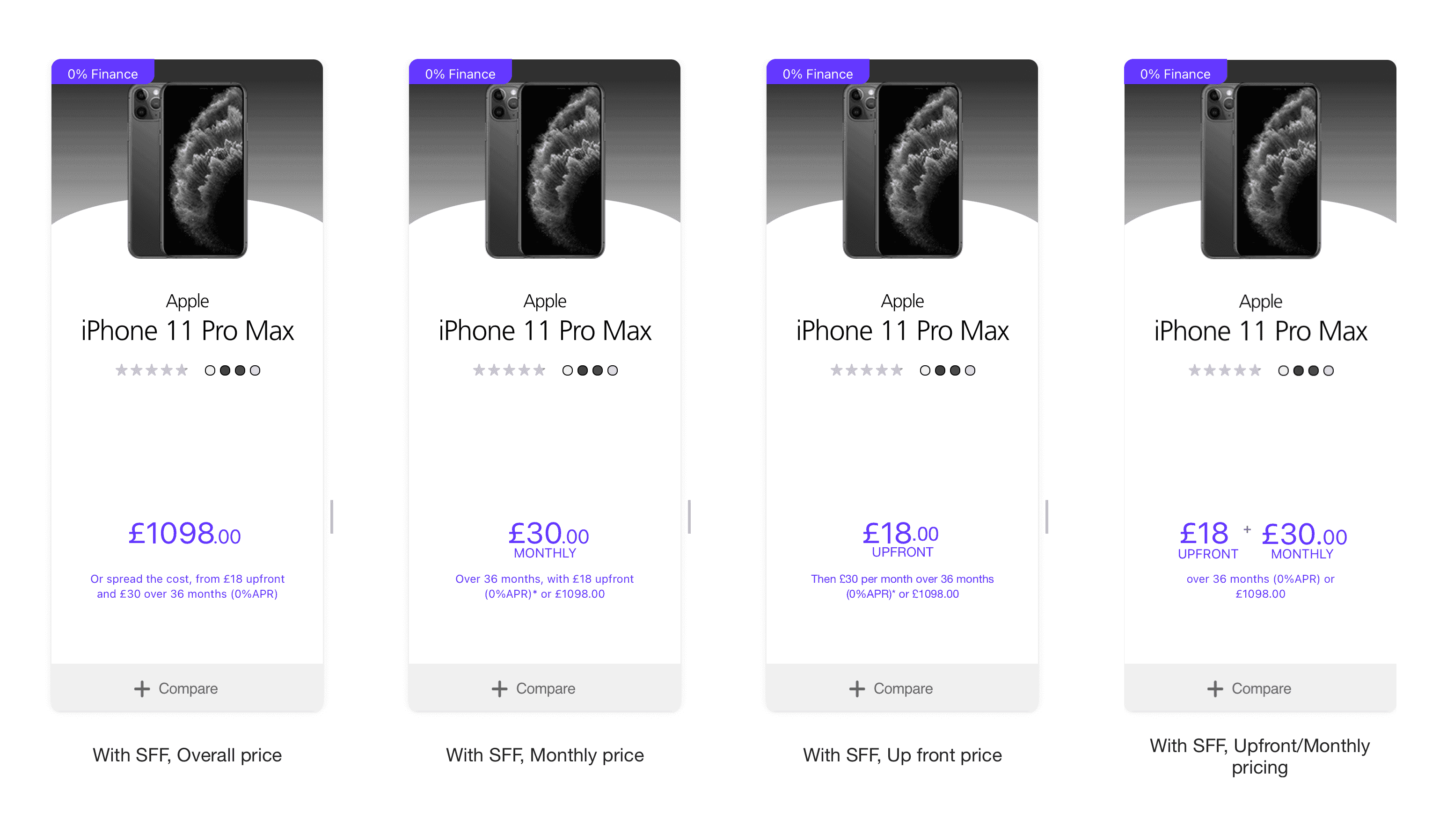 52 participants were asked which pricing they found most attractive. The majority were in favour of the upfront amount + the monthly payment. We went with this version, as it matched the pricing format for pay monthly contracts.